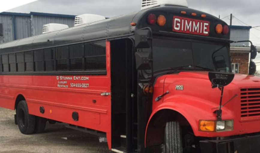 GIMMIE holds up to 45 passengers, Bluetooth (wireless) stereo system,15" L7 1ohm stable subwoofers (Wonderful Bass), 5-way 6x9, wireless microphone, 1 pole, red ostrich seats, black vinyl floor, red panel lighting, Glob LED lighting.